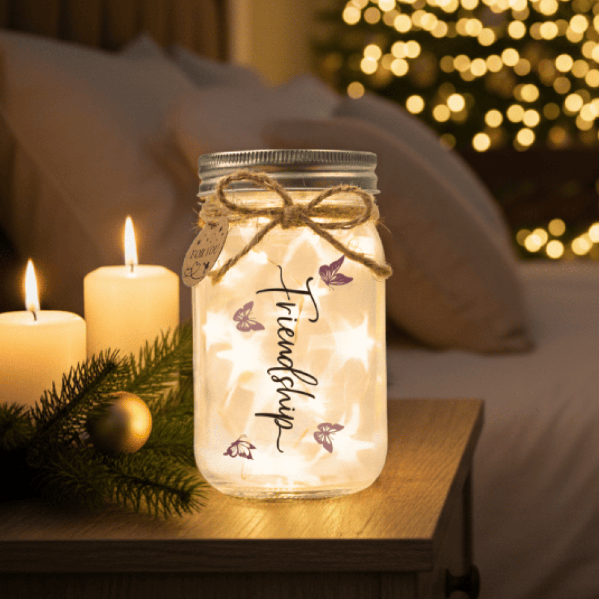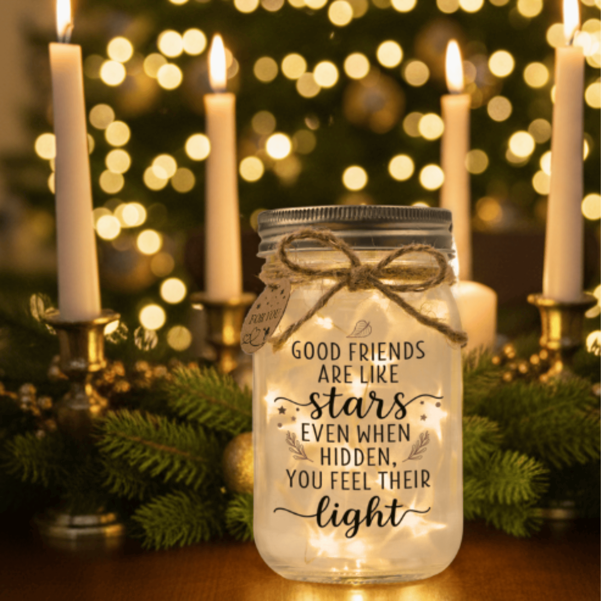 Today, Solamz creates gift-ready mason jar lights printed directly on glass. Inside, a frosted liner scatters the warm LED into a soft, starry glow—bedtime-friendly and beautiful on any shelf or table. Each order is hand-packed with a simple gift box plus a tag and twine so you can tie the bow yourself.